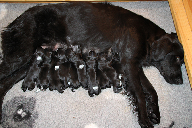 30.09.25. I dag er de skjønne tre døgn gamle. De vokser og trives.Det er mer fart i de når de våkner å skal ha melk. Hvis ikke Kimmie er kjapp til å legge seg så yrer det rundt henne. Noe hun tar med stor ro. Hun vet akkurat hvor hver og en er å legger seg ned der det er ledig plass å aker seg inntil valpene sine. Vi var ute å gikk en litt lenger tur også i går kveld. Kimmie stor kosa seg og var også veldig fornøyd når vi kom inn igjen. :-) Da ble hver å en vasket godt . Her er jente merket rygg og gutt merket halen