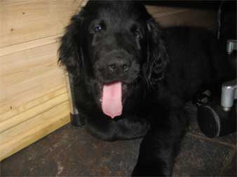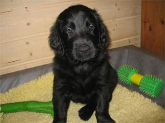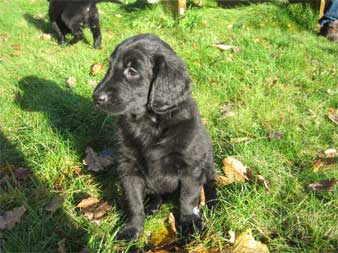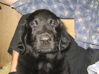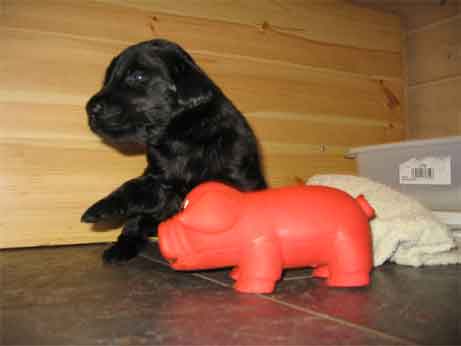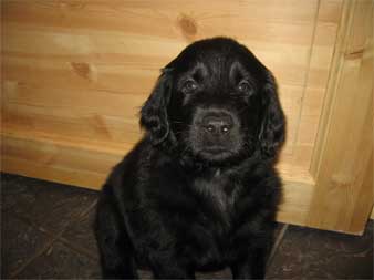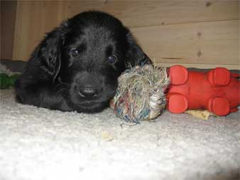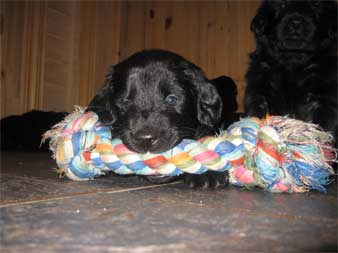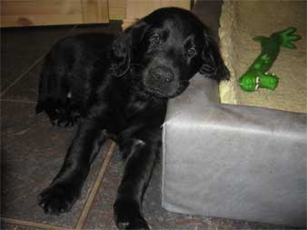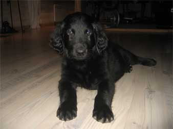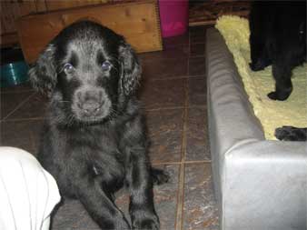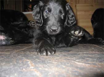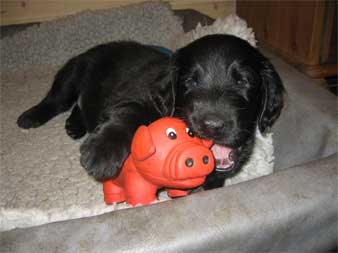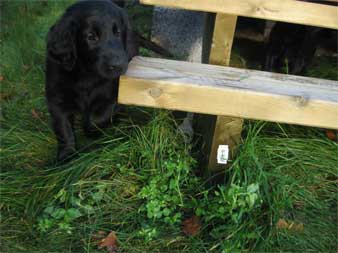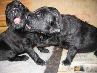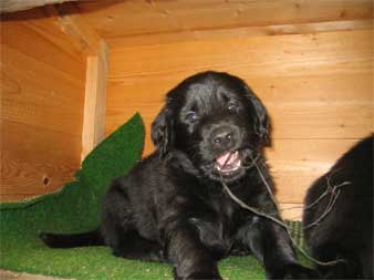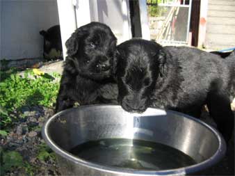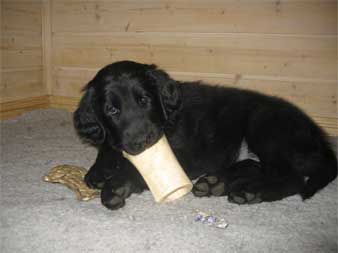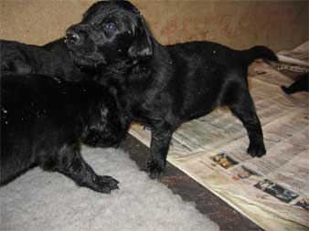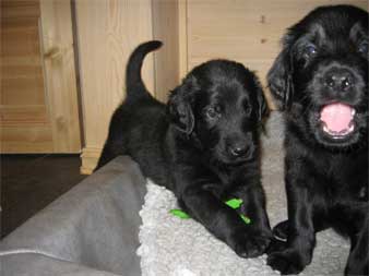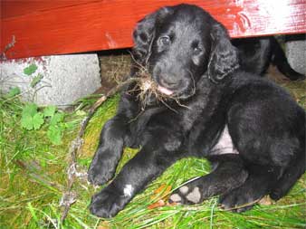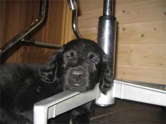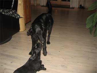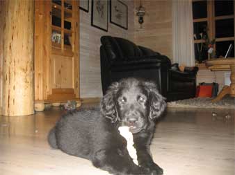 26.10.05. Her er Tassen og Kelly. Nå begynner det å bli fart i både tenner og kropper. I dag klatret de over stengsle inn til stua. Ute i hundegården går det så gress og jord spruter. Hobbyen for tiden er å finne ut hva som er under ting!!!!!!! De ser deretter ut også når de kommer inn igjen. Tær er nydelig delikatesse. Bare å tygge så hardt man klarer.