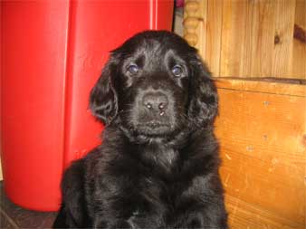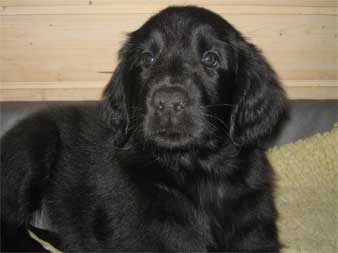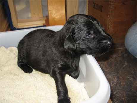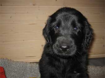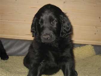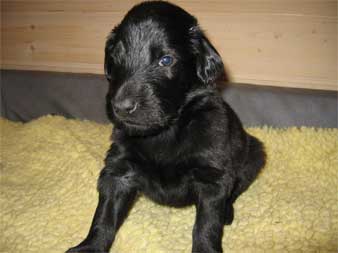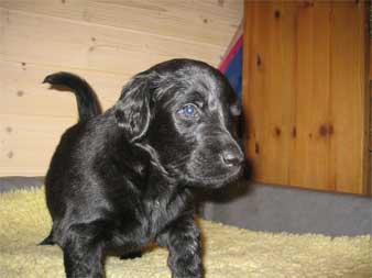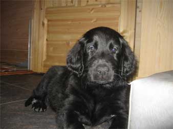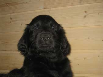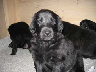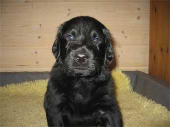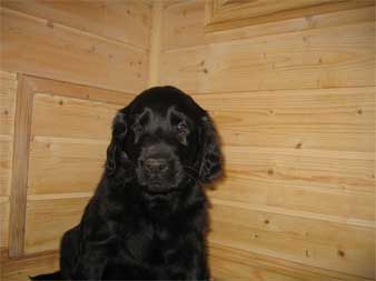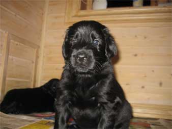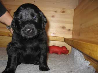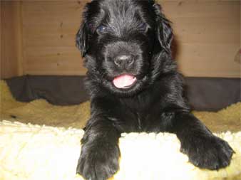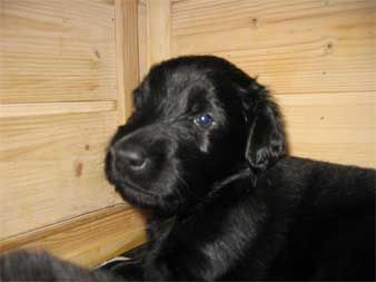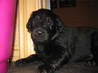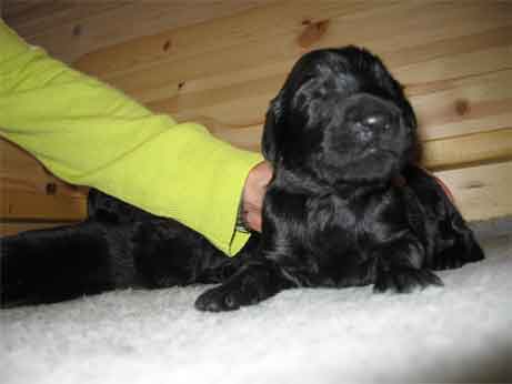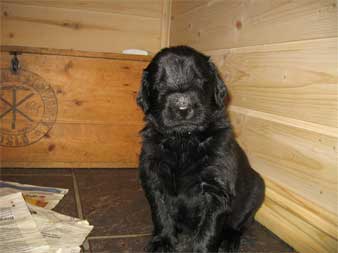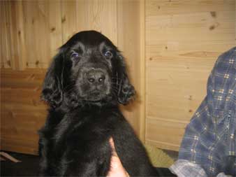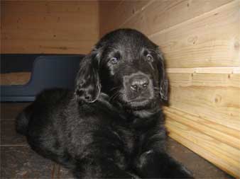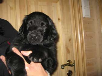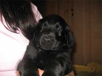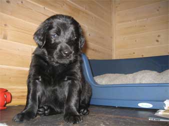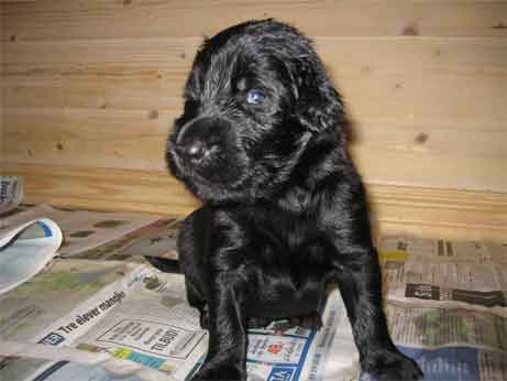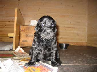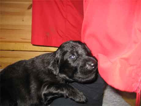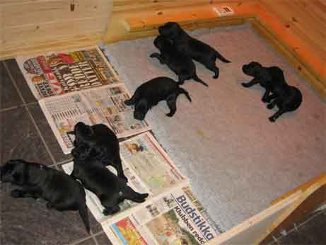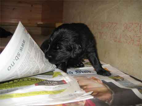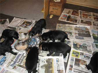 06.10.05. I dag ha det skjedd mye. Alle har fått smake litt Norwegian Polar hundemat , rørt ut som en grøt. Det var godt det. Vi har åpnet kassen slik at trollene kan få komme seg ut på avisen for å tisse og bæsje. De har begynt å trekke mot kanten når de må tisse nå ,og tar vi vare på denne rensligheten som ligger innbakt i valpene , er det mye lettere senere. Det er jo flott at de ikke har lyst til å tisse i sengen sin. Bilde nr 1 er Aron. Han titter ut i den store verden sin.