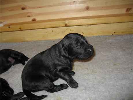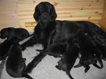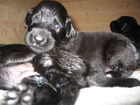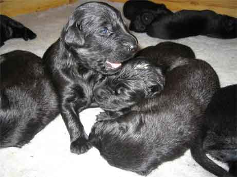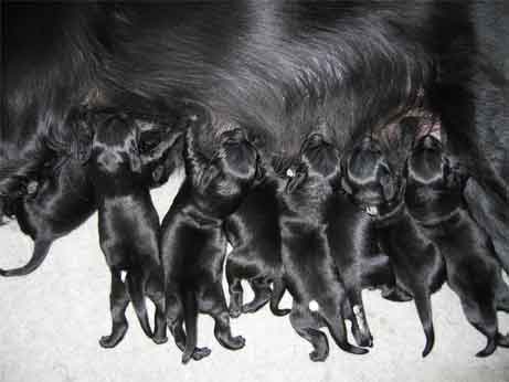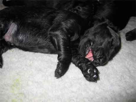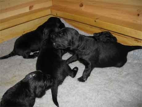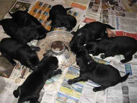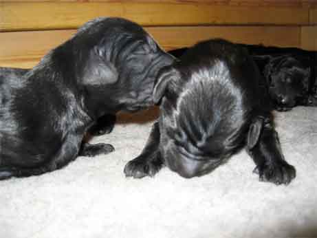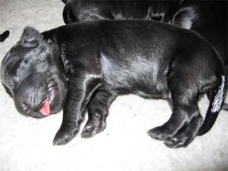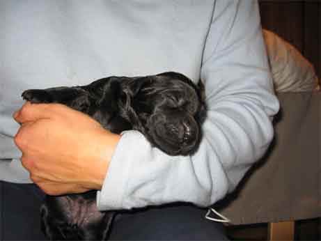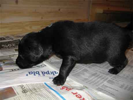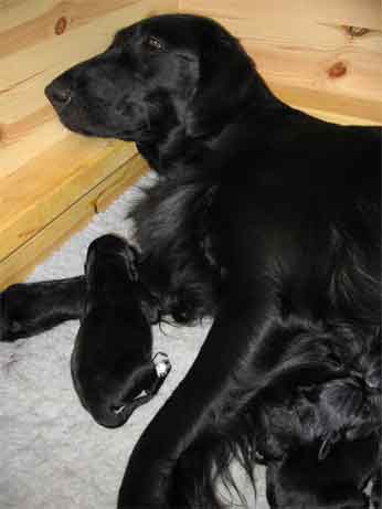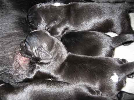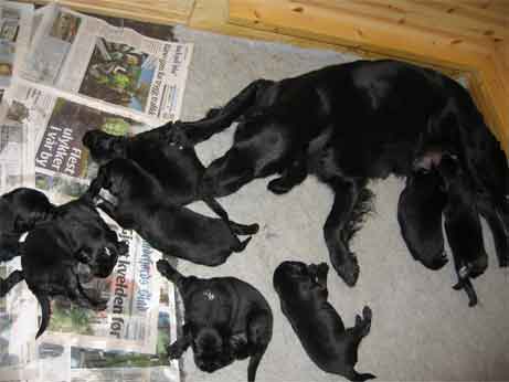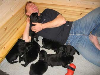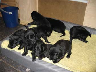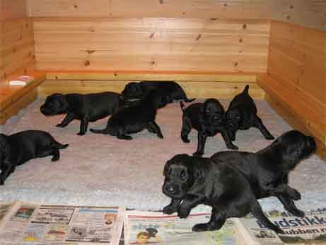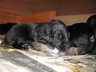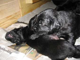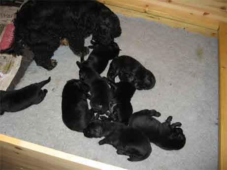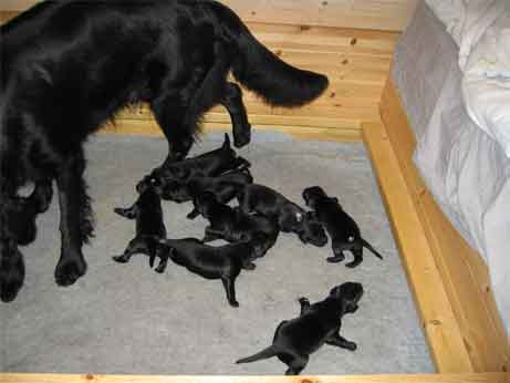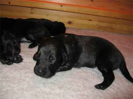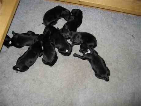 | 21.09.05 Ett døgn har allerede gått ,og trollene vokser så man nesten ser det. Alle hadde lagt godt på seg, når vi la dem på vekten nå i kveld. Kellie har vært ute og gjort i fra seg ,men hun er raskt inn igjen til de små vidundrene sine. Valpene fikk nytt rent teppe sent i går kveld. Da luktet de fælt og lette etter puppen med melk i teppet. De har to ting i hodet melk og sove.