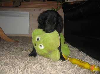 13.11.05. Taro koser seg som den eneste igjen. Han får masse oppmerksomhet. :-) Her har han fått låne frosken til Kellie. I dag har jeg vært på utstilling med Alana, Cindy & Ewita ,mens Kjell har kost seg her hjemme med Taro. Utstillingen gikk kjempe bra. Se resultater.
