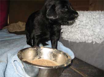 10.10.05. I dag har trollene fått sin første mat fra felles skål. Nå har de fått nytt navn. Grisungene.......Bilde nr 2 og 3 er Aron som leker. Alt skal prøves og sjekkes om det er spiselig.