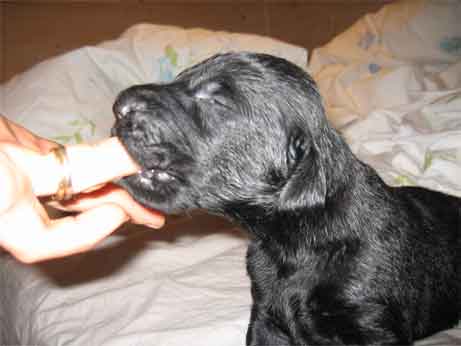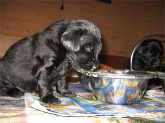 19.10.05.I dag er trolla 4 uker og 1 dag gamle. Fant akkurat ut at tiden flyr altfor fort. I dag har vi økt til 4 måltider pr. dag. Det var de veldig fornøyde med. Vi prøver å bære de ut så fort vi ser noen må på do. Og rett etter mat. Når jeg blåser i fløyta nå så kommer de. Utrolig hvor fort de lærer. Her er Taro og Lady.
