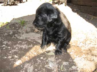 05.11.05.Pirajane har nå veeeldig skarpe tenner synes jeg. I dag morges klarte en av de fint og lage et vakkert hull i buksebenet mitt. Heldigvis detter disse pyton tennene ut ved 3 - 4 måneders alder. De spiser masse nå. Når matfatet var tomt i dag morges så var det om å gjøre å spre alle skålene rundt i hundegården. Er det noe rart vi kaller de troll.        Her er troll Aron og troll Zita. :-)