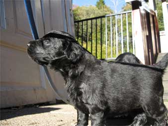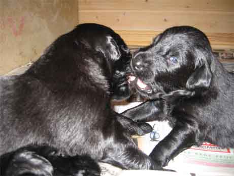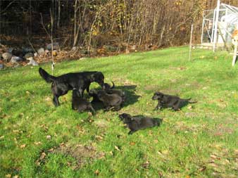29.10.05.Trolla er troll nå. Da jeg skulle gå  på jobb i dag morges måtte jeg jo si ha det. Det var mindre lurt med skjerf rundt halsen. 8 pirajaer hang jo fast i det på et blunk. :-) Kjell gikk å la seg igjen når jeg gikk. Tenkte han skulle sove lenge. Valpene hadde fått mat og luftet seg. Kl. 9. 30 presis som vanlig ,skulle alle ut for å tisse. Det var bare å stå opp igjen, og slippe de ut. Her er Zorro & Lady. Bilde nr 3 er begge to i lek.