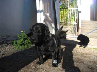 | 16.10.05. I dag har familien Sakariassen vært her på besøk. Etterpå kommer det en familie til. Vi har hatt alle ute for første gang i dag. Når de hadde spist maten sin så bar vi de ut slik at de fikk tisset og bæsjet ute. Det var litt skriking for dette var noe nytt. Men nyssgjerrigheten tok overhånd og ting måtte sjekkes. :-)  Bilde2.Taro Nr3:Lady&Kelly  Nr4:Lady,         Nr5Kiara. |