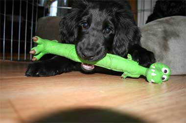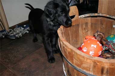 26.01.07.Nå ligner det mer og mer på store flatter. Det skjer så myer så fort i denne tiden her. I dag har Kellie hatt full jobb med å bære bamsene sine inn i valpe kassen. Hun skal vist låne de bort til trollungene sine. I ettermiddag så fikk hun plutselig feber og ved sjekk av puppene så hadde det blitt en kul i melken. Hun har gitt så mye melk nå i det siste og når trolla nå spiser mer og mer vanlig mat så blir det for mye melk. Nå ser det ut som om vi har fått det under kontroll igjen. Tempen har heldigvis gått nedover igjen og Kellie har spist litt mat. Her er Mac på tur og Santo som likeså godt satt seg på ballen sin.