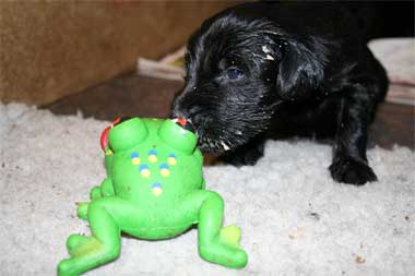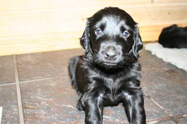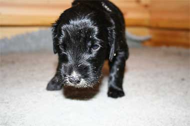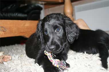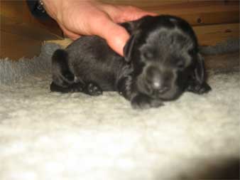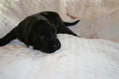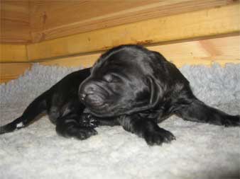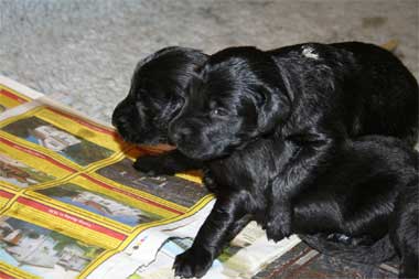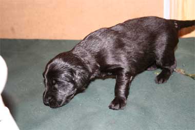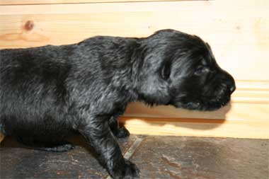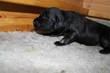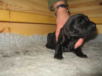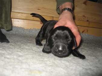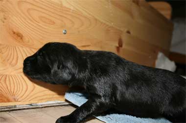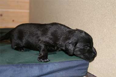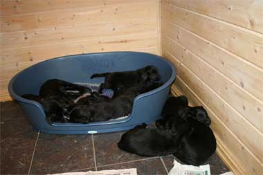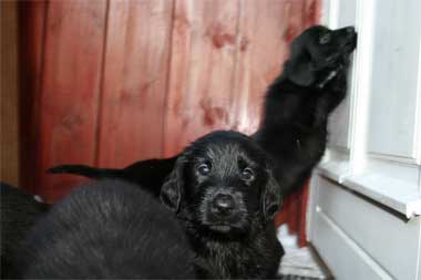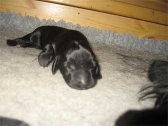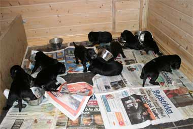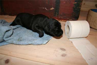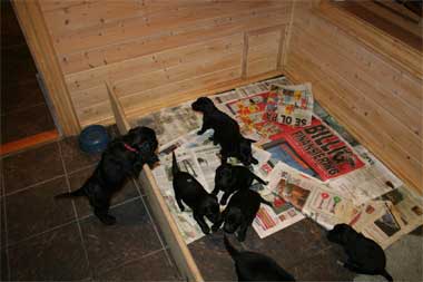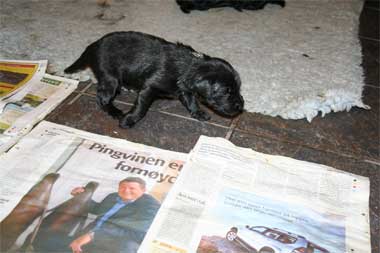 19.01.07. Nå begynner det å ligne på små hunder. Den første bitingen i i hverandre har så smått begynt. De prøver å gå ut på avisen for å gjøre i fra seg. Men det hender også at de får fremkroppen på avisen og resten er på teppet så kommer det noe ut bak. Men de er jo sikre selv da på at de er på rett plass. :-) Her er Gjøa som ligger å sutter på labben og Frøya som er på tur.