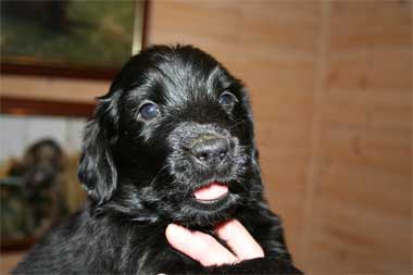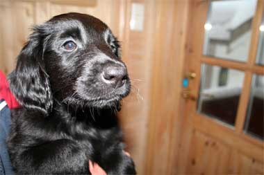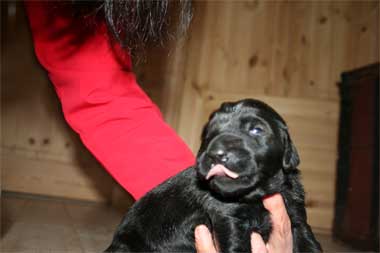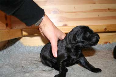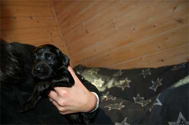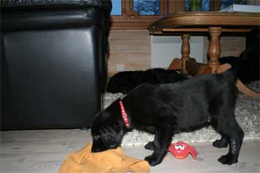 14.02.07. Tenk i dag er trolla blitt 6 uker. I dag skal vi ta en og en i et helt nytt rom for å se hvordan de takler dette. Så skal vi se litt på jakt lysten og jakt evnen. Vi skal også sjekke hvor fort de klarer å avreagere på uventet lyd. Vi får et mye større bilde når vi sjekker en og en valp slik. Da er det mye lettere å råde nye familier slik at man forhåpentlig får en hund som passer til seg selv. Her er Mac og Gjøa.