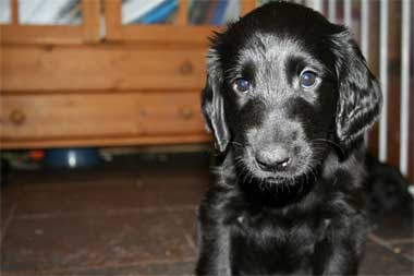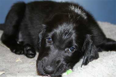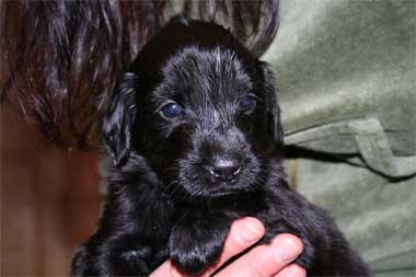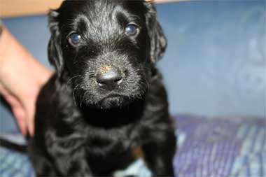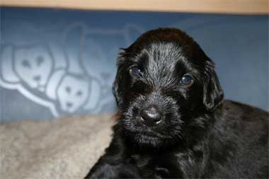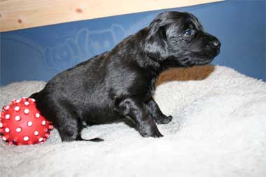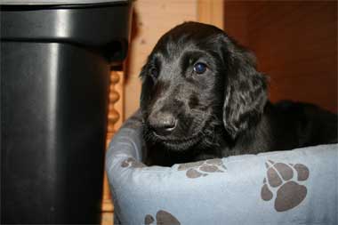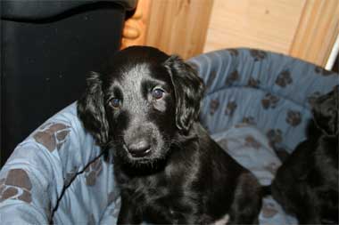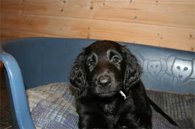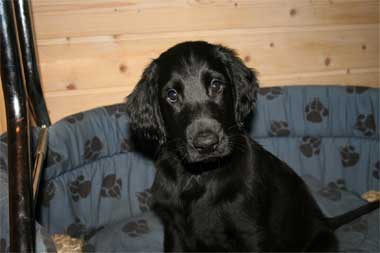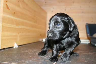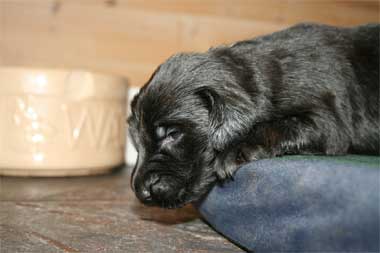 17.01.07. Nå har vi flyttet alle ned på valpe rommet. Der har de nå fått halve rommet. Med en av oss på camping seng ved siden av. Hundegalskap er det noe som heter vist. Lurer fælt på om vi kan være smittet av noe slikt. Vi har nå klippet klørne til alle. Phu det var deilig å bli ferdig med. Så har alle fått sin første lille smak på ordentlig mat. Gjett om det var populært. De smattet fælt. Her er Lhea som synes det er fryktelig høyt ned fra den stoooore hundemadrassen, så er det Leo og Mac.