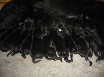 Kellie er en sprek dame som var med å gikk tur i skogen kl 9 i dag morges. Vi var hjemme igjen kl 9.30 og kl 12 startet hun fødsel. Det har gått kjempe fint med ca en valp i halv timen. Den siste kom etter 1 1/2 time og mange diskusjoner mellom Kjell og meg om det var flere. Her er Kellie med sine nyfødte troll. Så er det Chico & Lhea. Lhea leter etter melk i floss teppet.. Det er vi som har malt hvite prikker på de for å se forskjell.