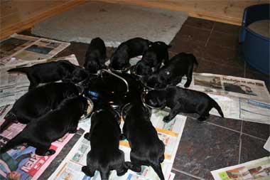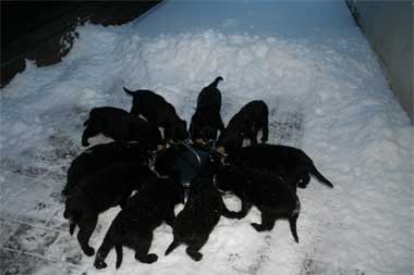 05.02.07. Nå slipper vi valpene ut ca 5 - 6 ganger pr. dag. Da får vi det meste av bæsjen ute. :-) De synes også det er spennende å utforske den stooore verden ute i hundegården. Her er Frøya og Gjøa .- Så er det melke bilen Kellie med alle sine søte små troll. Kjell gredde av Kellie en masse på lørdag for å slippe å få all den løse pelsen på gulvet . Så nå ser hun snart ut som en flat naken hund. Pelsen detter av fordi valpene suger all næringen fra henne. Den kommer heldigvis tilbake.