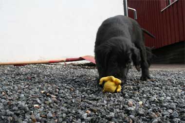 06.03.07. I dag har det regnet masse her. Men trolla må en tur ut å lufte seg med jevne mellomrom allikevel. Her er Chanel som har fått tak i en leke for seg selv og Balder som lurer fælt på når jeg kan få opp denne døren igjen.