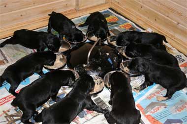 20.01.07. I dag har små trolla fått mat fra skål for første gang. Gjørme bryting kan man egentlig kalle det. De ser ikke ut den første tiden når de skal begynne å lære å spise fra skål. Her er Lhea på tur. Så er det Birk som like så godt går tvers over Mac. Så er det alle sammen.