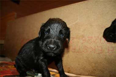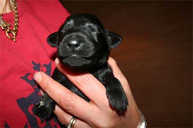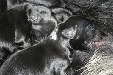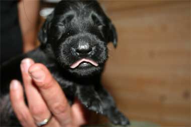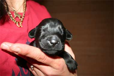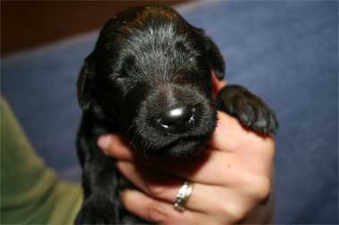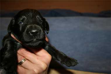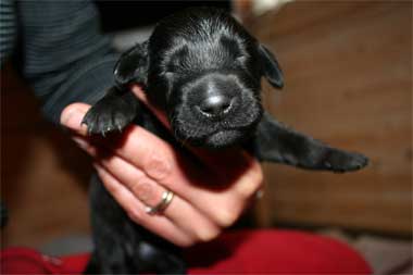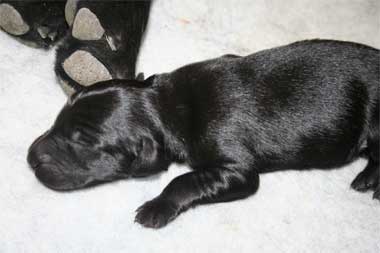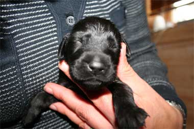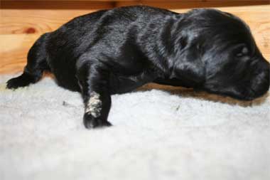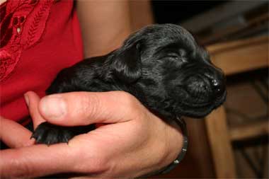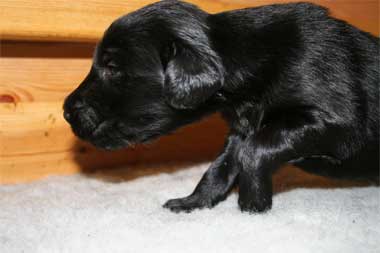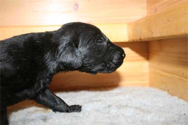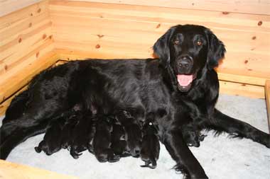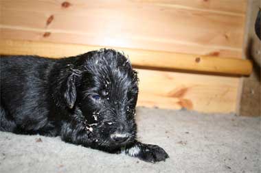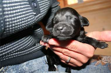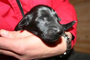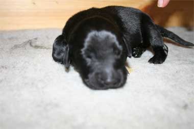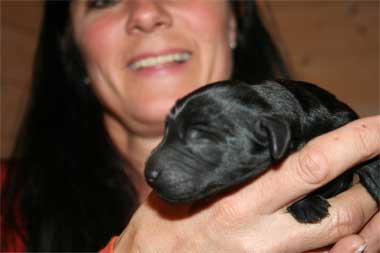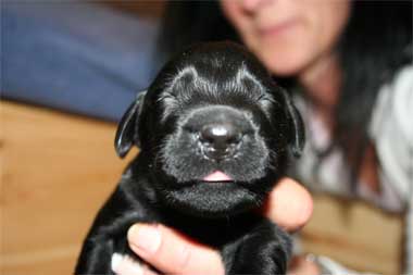 18.04.07. Fødselen har gått kjempe fint. Ewita er en meget rolig og sindig mor. Tar det å bli mor til 9 med den største ro. Wibeche var meget stolt av sin "datter" etter fødselen. Det er jo et lite under å sitte og se disse små flattene bli født ,hvor de kravler seg til puppen å begynner å suge med en gang. Nå skal det bli deilig å sove litt . Har ikke blitt mye søvn det siste døgnet da vi skjønte at nå er det ikke langt unna. De hvite prikkene som er på valpene er det vi som har malt på de for å se forskjell på de. Her er Grappa. :-)