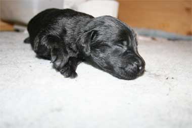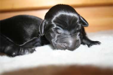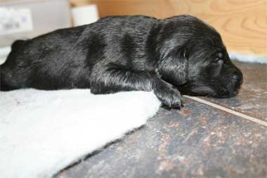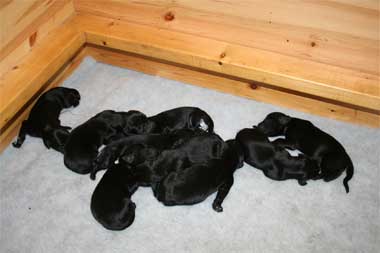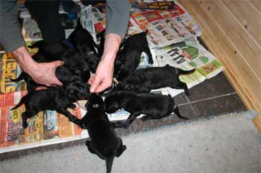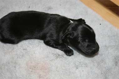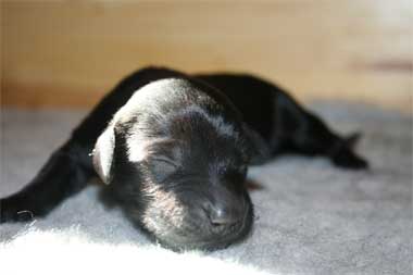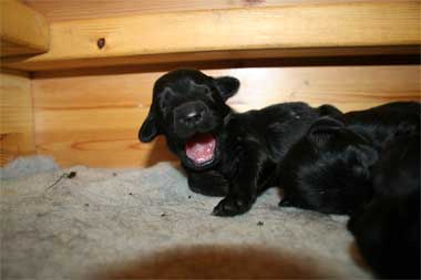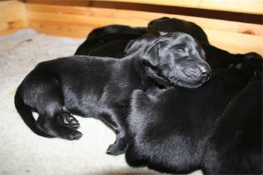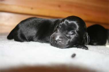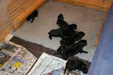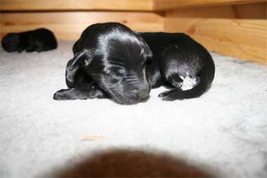 20.04.07.Her er trollungene Casper som suger melk og Nala som sover godt etter en runde med melke maskinen. Ewita er kjempe flink. Med 6 andre hunder i huset , tar hun livet som 9 barns mor med knusende ro. I dag var hun ute å lekte med ball sammen med de andre i ca 10 minutter. Så bar det i full fart inn til trolla igjen. Hun har ikke tid til å være alt for lenge borte fra dem enda.
