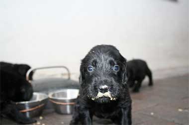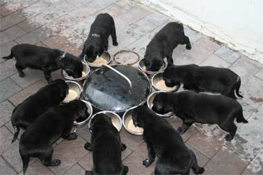 08.05.07. Nå har nasse nøff og vennene hans badet i matfatet noen ganger. Det er helt utrolig hvordan de klarer å få plassert hele kroppen godt i matfatet alle 9 !!!!!!!! De blir helt ville når jeg blåser i fløyta å setter ned maten. Fløyten bruker vi før mat hver gang. Da lærer de innkalling på lyd fra starten av. Når de flytter til nye hjem så er det greit å ha en fløyte. Alle valpene kommer på denne lyden da. Her er Teo og Maya.