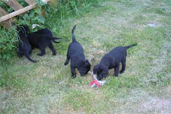 13.06.07. I dag skal Teo også reise. Tror han gleder seg masse til å få all oppmerksomhet. I går kveld var det full raptus i hagen. Da var det litt kjøligere og gjett om de hadde det gøy. De store fotballene til de store jentene fikk virkelig gjennomgå. Det var en del sure miner når vi lukket de inn i hundegården igjen. Den stooooore verden er mye mer spennende. Her er Teo & Alicia.