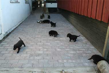 23.05.07. I dag har trolla blitt 5 uker gamle. Helt utrolig hvordan tiden fyker av gårde. Så i dag er det ny vekt kontroll ,mark kur og klo klipp. Vekten er ikke det store problemet på denne gjengen. Ikke annet en at vi må passe på at noen ikke blir alt for tykke. Luksus problem kan man jo kalle det. I går lot jeg døren stå oppe ut nesten hele dagen. De fleste var flinke å gikk ut når de måtte på do. Sengen til Ewita var veldig populær. Der sovnet alle i en haug mellom øktene. Her er Mikas og Teo på den første morgen turen sin.
