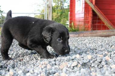 21.05.07. Phu i dag våknet jeg med feber. Da er det ikke like morsomt med 9 små troll som står å hyler for å komme ut. Men det er jo bare å sette i gang da. :-) Man blir jo nesten i bedre form bare av å se på de små sjarmtrolla. Så nå fyker de rundt ute i hundegården mens jeg sitter her å lager valpedagbok. De setter stor pris på å få komme ut. De smaker på alt nå. Små krypdyr som krabber er spesielt morsomt. Det meste av bæsjen tyter også ut så fort de kommer ut i fri luft. Her er Nala & Frikk.