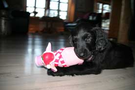 26.12.08.Kjell startet bak vakt uke i dag klokken 07.00. Det gikk jo så klart bare et kvarter før han ble ringt etter. Ikke veldig morsomt når vi har en del på planer for dagen. Så går nå å krysser fingrene for at han kommer fort hjem igjen. En del ting med valpene som det er greit å være to om. Hadde tenkt å ta de med ut på tur ,så vi får håpe at han ikke må jobbe helt til det blir mørkt igjen. Og det er jo noen som kommer for å hilse på med jevne mellom rom også. Trolla er forøvrig i kjemp slaget om dagen. Det går så det suser. Fryktelige hjelpsomme i det meste. Vi jobber nå med at man har lov til å gå over gulvet uten at en liten piraja skal bite seg fast i buksen. Mye man må lære i ung alder synes de når vi er strenge her. Her er Kira & Zita som er sperret inne igjen etter morgenens raid i stua og på terrassen. Kira lar det gå utover julegrisen de har rappet av Charmen.