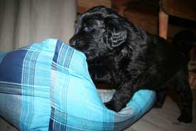 09.12.08. 4 banden er jammen blitt flinke. I går var det bare 2 bæsjer som havnet på gulvet inne. Jeg bærer de ut så fort de våkner , og da fyker de til alle kanter for å gjøre i fra seg. Det er så deilig når ting havner ute og ikke inne. Alle gardinen i stua er nå hengt opp med klyper. Fikk så veldig god hjelp til å ordne opp i dem. Så det var like greit å gjøre det slik. En plante måtte også opp fra gulvet opp på en stol. Den var det veldig moro å se om det gikk å plukke av alle bladene. Cindy har nå begynt å ta igjen med trolla sine. Hun snakker til de når de biter som verst i henne. Var en stund redd for at hun var alt for snill , men hun klarer å si i fra hun å heldigvis. Dette er jo også noe av læringen de må igjennom, at man faktisk må oppføre seg ordentlig :-) Her er Tiril & Heena som har funnet hver sin hundeseng.