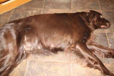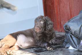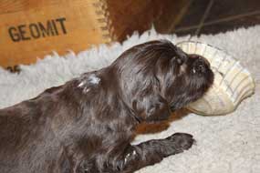 04.06.10. I dag er det siste dagen jeg skriver i valpedagboken. Det er ganske så vemodig. Tasha reiste også hjem til Morten i går kveld og har heldigvis slått seg helt til ro igjen der. Teo er igjen her til i morgen tidlig før han flytter hjem til sin familie. Så han har ligget i bur på soverommet i natt. det har gått veldig bra. Han peip litt midt på natten så jeg bar han ut så han fikk tisset. Så sov vi videre. Han våknet å klynket litt inni mellom, men da han fikk handen min inn i sprinklene og en roende stemme så sovnet han igjen. Kjell luftet å matet hann ved 5 tiden så var det rett i buret igjen. Det var da jeg våknet av et kjempe ul. Da var han nemlig veldig våken. men fikk heldigvis roet han ned igjen så vi lå faktisk helt til 8.30. Ellers så har han og Zaga ordnet opp her. Vann i vann skålen er ikke der for å drikkes men for å graves ut. ......Er det mulig å få til så mye søl på så kort tid. Men gøy det hadde de. Her er lille Teo god og våt etter alt sølet de ordnet.