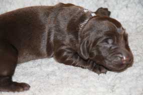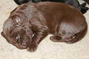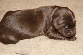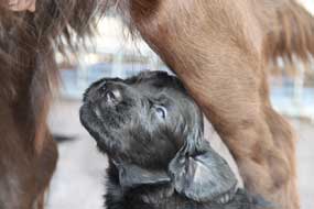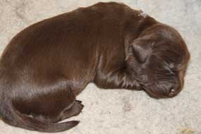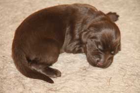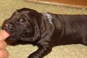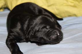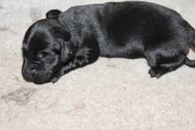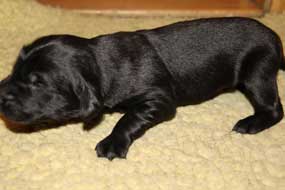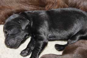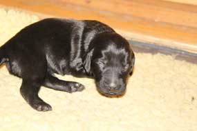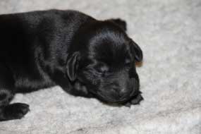 11.04.10. I dag er trolla 2 døgn gamle. De spiser godt å det er nesten så man ser de vokser. Tasha har vært med en times tur i skogen i dag i pen været. Det falt godt i smak. Hun løp å koste seg med resten av gjengen. Men etter at hun har vært ute så har hun ikke rikket seg fra valpene igjen. Hun er en skikkelig hønemor som stor koser seg med de små. Hun er veldig forsiktig når hun skal legge seg ned og er nøye på at ikke det ligger noen der hun skal legge seg ned. Det er så deilig å se at hun tenker over dette. De er jo så små at de ligges fort i hjel hvis en digger mamma plutselig legger seg på en. Her er guttnakke og sort gutt.