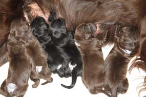 10.04.10. Klokken 7.30 i dag morges så kom den siste morkaken. Da ser det ut som om roen har senket seg og alt er kommet ut som skal ut. Nå klokken 16 ble alle veid og ale har lagt på seg etter fødsel. det er deilig. Tasha er rolig og koser seg med små trolla sine. Det er vi som har malt de med hvit for å se forskjell på dem. Her er Tasha med sine skjønne små, Brun jente merket nakke og sort jente.
