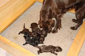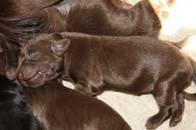 Klokken 21.10. Nå er fødselen startet- 1 brun tispe og en sort er født. Det er mange flere som sparker å vil ut