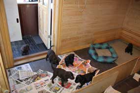 24.04.10. Her er alle trolla med ny stor plass. Det var kjempe spennende å få en større verden. De skjønner ikke helt enda at rumpa også må være med over på avisene før de tisser ,men det kommer i løpet av noen dager :-) I dag har de spist av en egen skål for første gang. De får jo ikke så mye enda ,men man ,må jo øve på bordskikken.Bilde nr 2 er gutt rumpe 6 Bilde nr 3 er jente rumpe