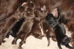 13.04.10. Tasha koser seg godt med trolla sine. Når har hun begynt å la de ligge litt alene når de sover og komme inn i stua til oss andre. Men med den minste lyd i baby callingen så er hun inne på valpe rommet igjen. Hun lurte litt med en gang når det begynte å pipe på bordet. Hun hadde jo ikke lagt fra seg noen av barna sine der :-) Så hun satt seg ned foran callingen å skakket på hodet. Hun er veldig rolig å fin med de andre hundene. Hun er tydelig veldig trygg på at ingen rører hennes barn . Når Tasha slipper ned melk til valpen så ser man at halene buer seg og de drikke av alle krefter. De ligger først å tråkker og napper i juret for å stimulere at melken skal komme ned.Se på bildet hvor ivrige de er.Bildet nr 2 & 3 er sort jente og jente nakke.