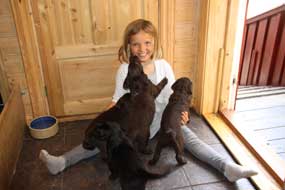 18.05.10. I dag har sola stått ordentlig på. Trolla søker fort i skyggen ute nå. det blir nesten litt for varmt innimellom for dem. men med besøk så kvikner man jo litt til for å få masse kos da. Så er av bryteren på igjen og man bare sover. Nå er alle tre guttene fordelt. Så sort gutt har fått navnet Leo, guttrumpe heter Teo og guttnakke heter Linus. Med jentene så tar det jo litt lenger tid siden vi skal ha en selv. Vi venter helt til de er rundet 7 uker med å ta et valg. Dette for å få med oss mest mulig i forhold til de egenskapene vi trenger videre i forhold til avel. Alle er jo like herlige og gode så dette blir ikke lett. men dette er jo et luksus problem da og ha 3 like flotte jenter å velge i og at dette er vanskelig. :-) Her er Jente rumpe og Teo ute i hundegården.