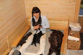 29.05.10. I dag kommer Inger Johanne å skal være barnevakt her. Vi reiser til Gjøvik på jakt prøve med Nikita & Kellie. Inger Johanne er populær i valperommet. Hun sitter å koser masse og de elsker å sitte på fanget hennes. :-) I natt begynte de å gi beskjed om at de ville ha mat ved 4 tiden. Hmmfff... det var jo litt tidlig da. Men grinden til stua var heldigvis lukket så de ble på valpe rommet. Kjell måtte sjekke hva det var de holdt på med så tidlig. det lysner så tidlig nå så de er helt sikre på at nå er det morgen og vi kan stå opp. :-) Her er Linus & Leo