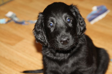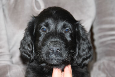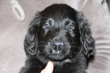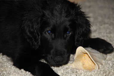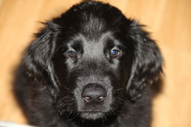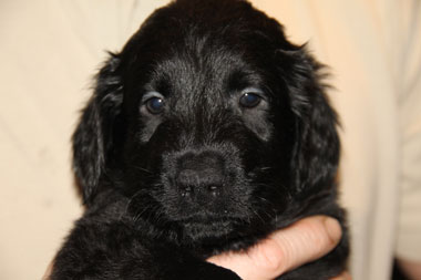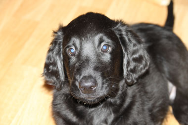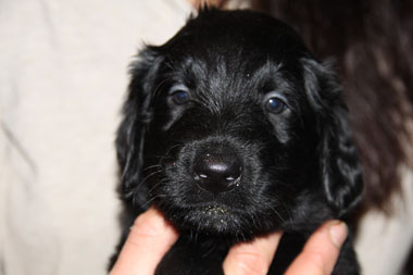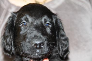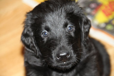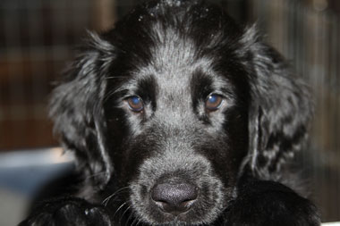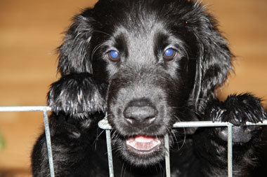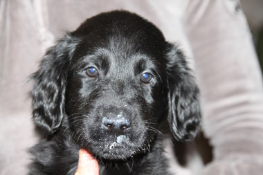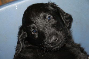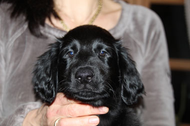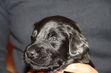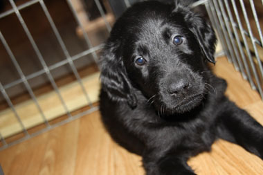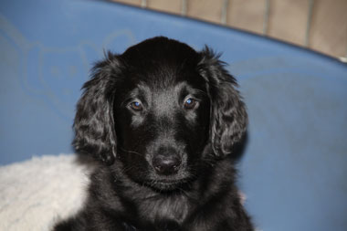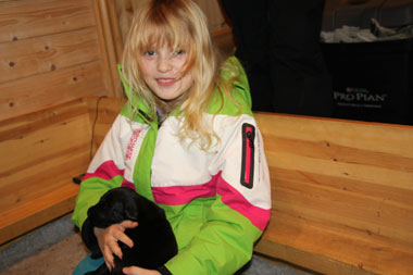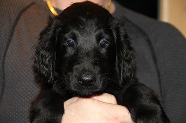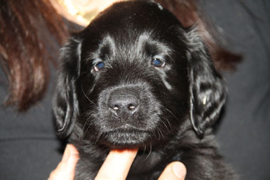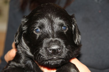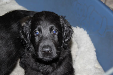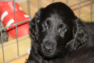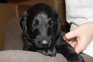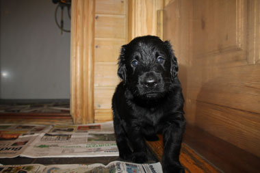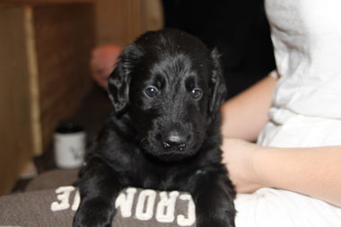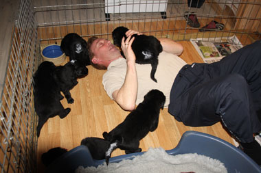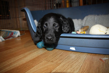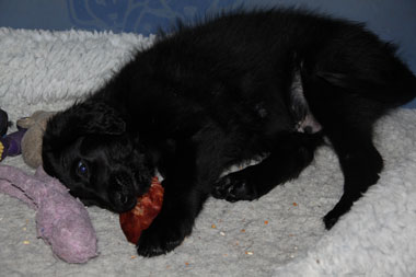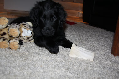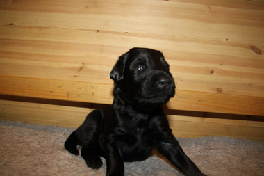 07.02.11. Leo trives godt som alene valp. Han får jo all oppmerksomheten og treningen selv. Han har sjekket om det går ann å bruke melkebilene Lhea & Nikita. Det fant han ut ikke var så lurt. Her får han grei beskjed. :-) Han stor trives når vi trener med han . Det er gøy det. Han har noen helt utrolig mørke øyne. Man blir liksom borte innover i noen mørke tjern. I går kveld var han med på biltur igjen for å trene på dette. Lå helt stille og rolig i buret det meste av tiden,men hadde litt konsert inni mellom i starten. Han var også med i skogen med de voksne. Dette var kjempe spennende . Han hang litt på armen inni mellom så det ikke skulle bli for langt for han å gå :-)I natt har han ligget i bur ved siden av sengen. Dette taklet han også kjempe bra.Her er grom gutten i går kveld.