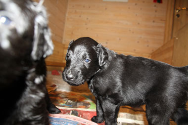06.01.11. I går har trolla vært en del i stua i en valpegård der. Mie turnet opp og ned hele tiden å var så fornøyd over at de campet sammen med henne. De flytter snart inn i stua for godt. Lhea nærmer seg fødsel og Nikita er jo hakk i hel å da får de valpe rommene med føde kassene. Trolla leker masse nå. Tennene har også nå bryti godt i gjennom . Så nå er det ikke lenge før de er helt pirajaer. :-) Her er Gutthode & guttHb i full fart.