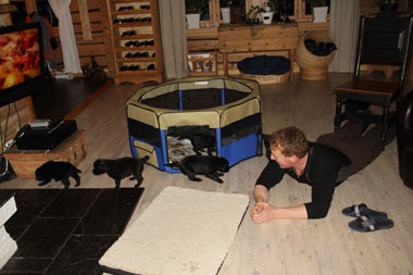 15.01.11. I går kveld flyttet trolla ut i stua slik at begge de to jentene her som skal ha valper fikk egne rom til det. Stue hunder er noe de setter stor pris på å være. Her er det rett ut på verandaen også når de må tisse eller bæsje. Kos med Kjell i lekegrinden. Her er gutthode og gutt hb.