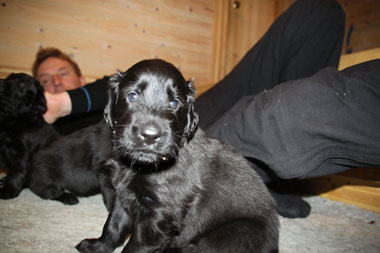 26.12.10. I dag har vi strøm stans her på Vesterøya. Så har nå ventet å ventet på strømmen ,men husket plutselig at vi har jo mobilt bredbånd så får da allikevel sendt ut valpedagboken:-) Godt vi også har peis å fyre i og en gass ovn til å ha inne hos valpene. Kulda kryper fort inn nå kjenner jeg. Trolla har nå fått hørselen i bruk. De skvetter opp når vi kommer inn i rommet. De ser oss også nå. Tenker ikke bare på melkebilen hele tiden. Nå kryper de godt inntill oss når vi legger oss ned til dem. Men fingrene må jo sjekkes ut om det er noe melk i disse da. I går kveld og i natt har Merethe og Chico og Inger Johanne og Dino vært her på jule kos. Vi skravlet jo trening og dressur helt til klokken var 3 i natt. Trolla sov da sin søteste søvn. De brydde seg døyten om at det var natte besøk her. Men de er jo våkne tidlig så det var bare å stå opp når de var klare :-) Her er guttrumpe & GVB.