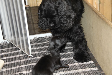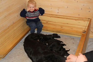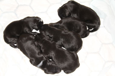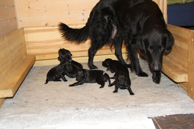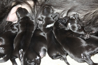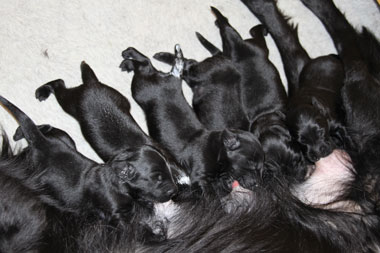 .Nå er klokken blitt 10.40. og Nala har roet seg helt. Så tror nok nå at det er tomt der inne. Nala stor koser seg med barna sine. Bryr seg døyten om at Knoll & tott raser rundt i stua utenfor valperommet. Døren står oppe slik at hun får med seg hva som skjer, bare med grind så ikke de to nysgjerrige rampetrolla skal sjekke hva hun holder på med :-) Her er et bilde av 6 silkesvarte gutter. Så er det en fornøyd Nala med sine 6 skjønne troll.