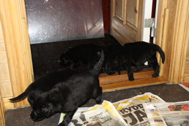 25.12.10.I dag morges åpnet vi valpekassen. Så nå kan trolla gå ut av sengen sin for å tisse. Når de begynner å trekke mot kantene før de tisser så er det viktig å åpne opp slik at de kan gå vekk fra der de sover tidligst mulig. Da tar man vare på det naturlige instinktet med at at man helst ikke vil ha alt dette griset der man sover. Men de er jo ikke helt glupe enda da :-) De setter forbena over på tisse lakenet så tisser de. Hmf.... hvem har sagt at man må ha med rumpa også over på doen da :-) men dette løser seg i løpet av få dager. De ser ut til å sette pris på større plass også. Verden ble plutselig KJEMPE stor. Her er gutthb på tisse tur,så fant han en finger med melk i farten å hektet seg fast der så er det ghode som sitter å titter på den stoooore verden. Det siste bildet er alle sammen.
