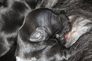 11.12.10. Da er trolla blitt 1 døgn gamle. Den første natten er overstått. Kjell har "sovet" nede med trolla og Nala ,mens jeg har sovet ut oppe sammen med kattene. :-) Jeg skal en tur på jobb i dag å vi fant ut at jeg burde lukke øynene litt hvis jeg ikke skulle gjøre alt for mye feil i løpet av lørdagen. Nala stor koser seg som mamma igjen. Hun er så rolig å flink med guttene sine. Tar livet med stor ro. Hun har masse melk og trolla spiser til de sovner. Så ordner Nala rumpevasken. Her er det full service. Det er forresten vi som har malt de med hvite prikker slik at vi kan følge nøye med på alle hele tiden. Her er gutt merket rumpe & gutt merketVbakben. Øynene er jo foreløpig lukket. De åpner de når de er ca 10- 14 dager gamle.