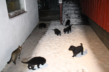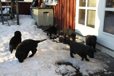 13.01.11. I går var trolla ute 3 ganger for å trene på å tisse og bæsje ute. Ganske gøy når gutt rumpe står å hyler på døren utpå kvelden og jeg lukker opp ,og han går ut å bæsjer. Da skjønner de fort tegninga synes jeg. Han gikk ikke så langt da. Fikk akkurat rumpa over terskelen så satt han der.:-)Merethe og jeg slapp de alle 6 en tur på verandaen også tidligere på dagen. Der var det også kjempe spennende. De er ganske så trygge på nye ting. Snø var rart og morsomt. Bæsj kom det også ute og en av de tråkket jeg godt oppi. Merethe hadde det da veldig morsomt !!!!!!!! Her er alle på terrassen i går formiddag,så er det guttrumpe & guttvb. Siste bildet er alle ute i hundegården i går kveld. Godt hjulpet av Mie.
