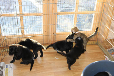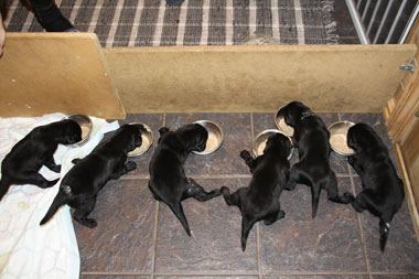 09.01.11. I dag skal vi ha valpetreff her for amrik valpene :-) Gleder oss masse til å se de igjen. Når valpetreffet er ferdig så kommer første familie på besøk til Skjønne gjengen. Så kommer neste familie 1 1/2 time etter på. Så det blir full dag med masse oppmerksomhet for små trolla. Tror nok ikke familiene til Diva & Marley klarer å la være å sette seg ned sammen med dem også :-) Nå får trolla 4 måltider mat. Det faller godt i smak. De blir veldig gode å mette og kjempe tykke i magen :-) Det første bildet er gutthode så er det gHB.Siste bildet er familie idyll. Nala som koser seg med sine skjønne små.