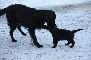 19.01.11 I går var trolla kjempe flinke. Det ble kun en dam på gulvet i løpet av formiddagen. Hvis vi er raske til å åpne døren når de hyler så får vi faktisk det meste ute nå. De stor koser seg ute på verandaen. I går var det så mildt og fint at vi var en del ute. De kommer når jeg roper nå. Blide og fornøyde med oppmerksomhet. I natt sov jeg nede ved siden av Lhea. Det er i rommet ved siden av stua med døra oppe. Trolla har blitt så steile nå på at de vil ha opp døren når de må på do så både klokken 12 og kl 3 i natt var det bare å stå opp å slippe ut den som måtte på do. Phu... ikke bare bare med flinke valper kjenner jeg Her er guttrumpe & GVB.