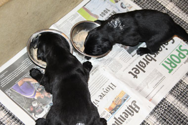 28.12.10. I går fikk trolla smake sin første hundemat. Å det var godt det. De smattet og lette etter mer. Så i dag skal de få en ny smak. Nala synes også dette var ok da de fort fikk litt mat utover i pelsen. Hmmmm. Du som hun skulle vaske da. Her er Gutthode & Gutthb.