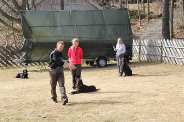 Da var dagen kommet for det andre og siste valpetreffet for R gjengen. Dagen opprant med strålende sol og 2 familier som stilte opp blide og fornøyde for nye innputt. Vi har Alana her som er kjempe dårlig i lungene men det har sett ut som om hun også har kost seg med besøk her i dag. Hun har tuslet med på både feltsøk og lydighets treningen for robuste trolla. De er forøvrig blitt noen skjønne tenåringer med en kjempe innsats av innlæring og oppdragelse av sine familie. Et stort tusen takk for den jobben dere har gjort med MIra & Teo. Det er blitt to veldig lydige og flotte hunder. Vi startet dagen med innlæring av felt søk og dette fikset begge to til fulle. Her er det bare å gå hjem å trene videre på flere gjenstander og variasjon for begge to. De søkte bra ,fant dummien og tok den mykt i munnen begge to.