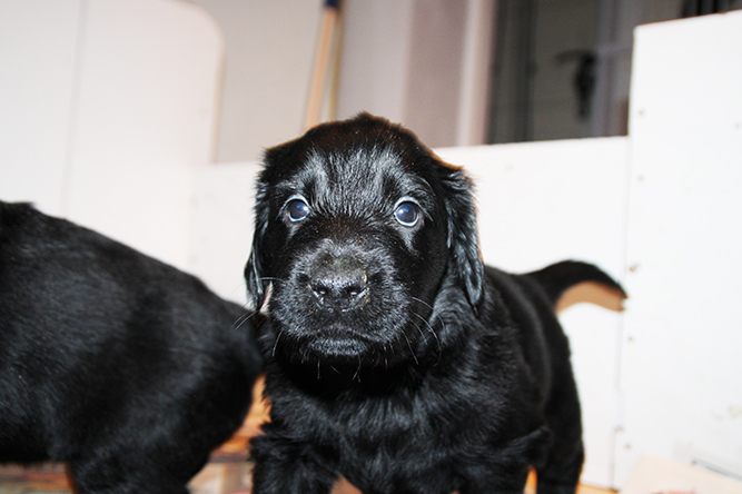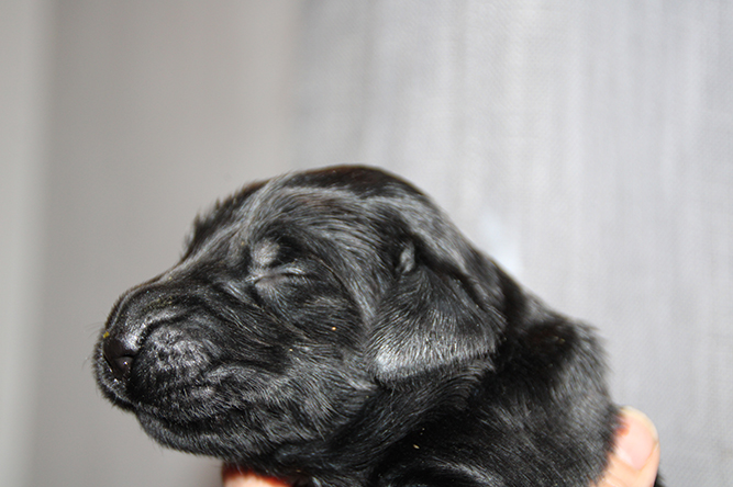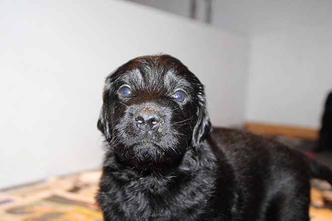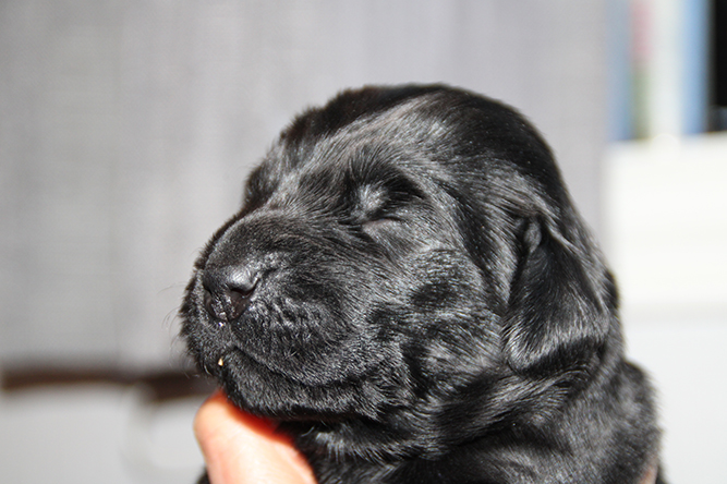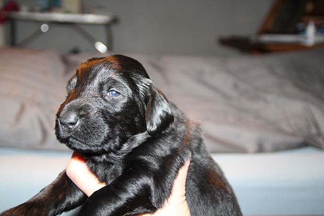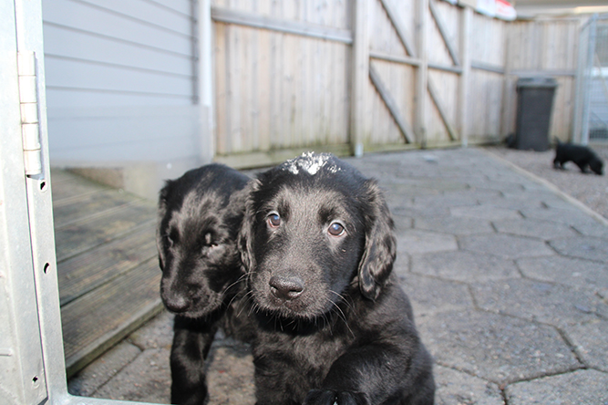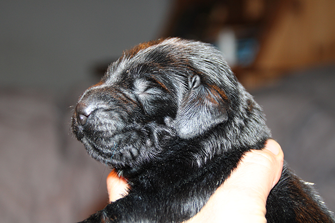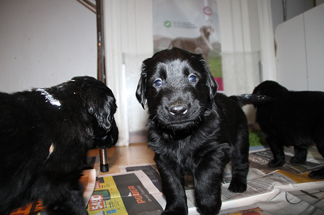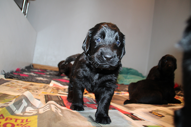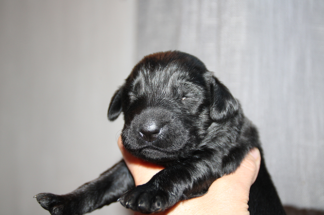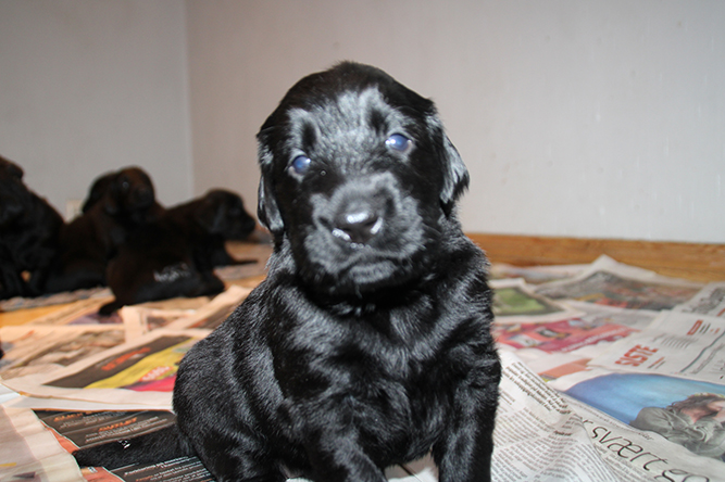 30.01.25. I går mistet vi Lava. Hun var dessverre ikke utviklet nok så det gikk ikke mer :-( Kjempe trist. De sorte gullene er blitt så flinke nå til å løpe ut for å gjøre i fra seg når døren går opp. Vi har minket bra på aviser på dag tid så nå er det bare noen rett ved døren. De kommer nå når vi blåser i fløyten. Og er blitt så flinke. De kosa seg med besøk i stua i går. Og når vi skulle inn på valperommet igjen var det noen som klarte å gå hele veien selv :-) I går kveld prøvde vi å gi eukanuba uten å mose den til grøt. Å jammen gikk det ned så det suste. Så nå begynner det virkelig å bli små flinke hunder her :-) Jeg må jobbe ekstra i dag pga sykdom men Inger Johanne passer hus å hunder. Så alle er i trygge hender her :-) Her er jente rumpe /Lunaog gutt rumpe/Atlas