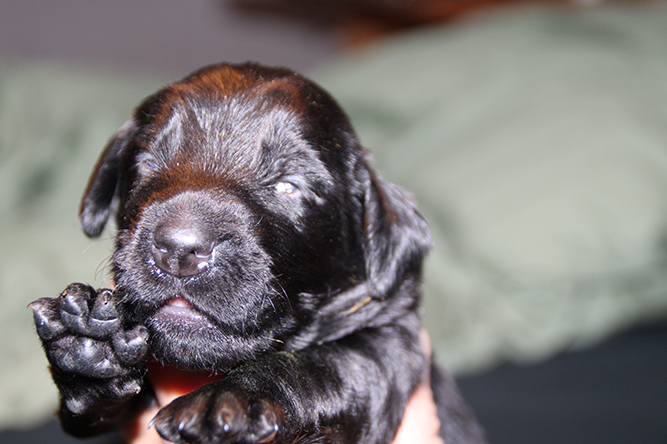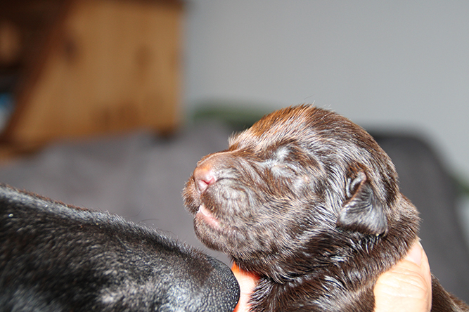 Kl er 21 og det er kommet totalt nå 4 sorte tispe, 1 brun tispe og 2 sorte hanner .Usikker på om det er flere valper men vi mangler en morkake og det kan ligge flere innunder ribbene . vi får bare vente å se her :-)