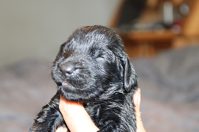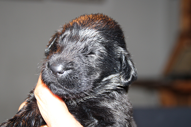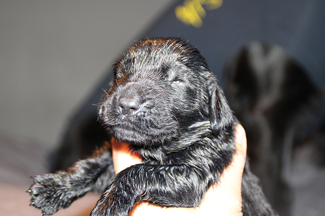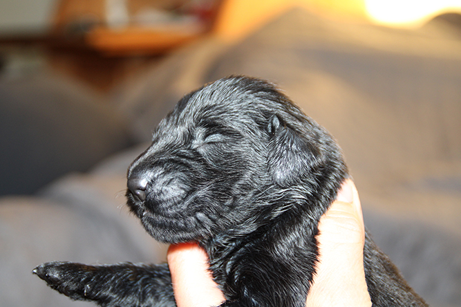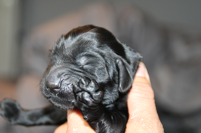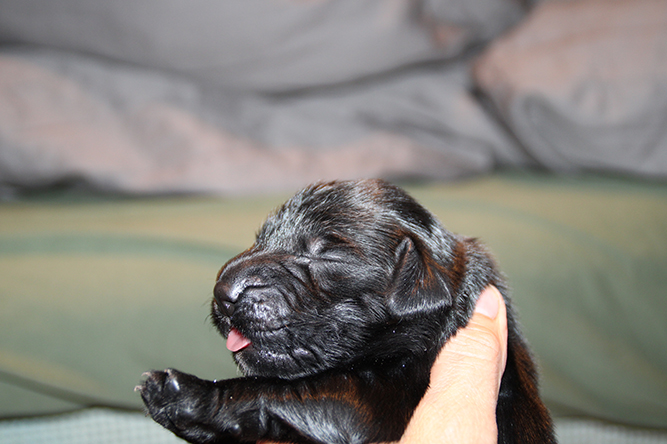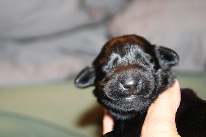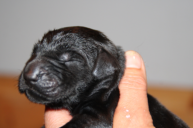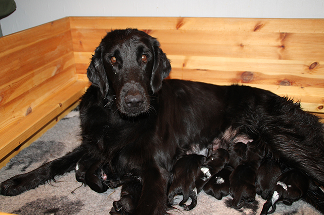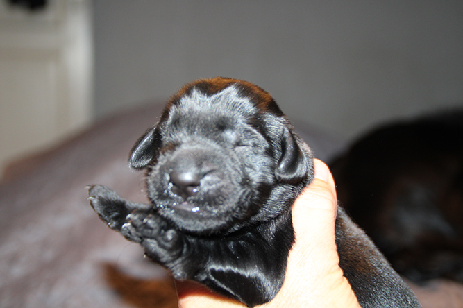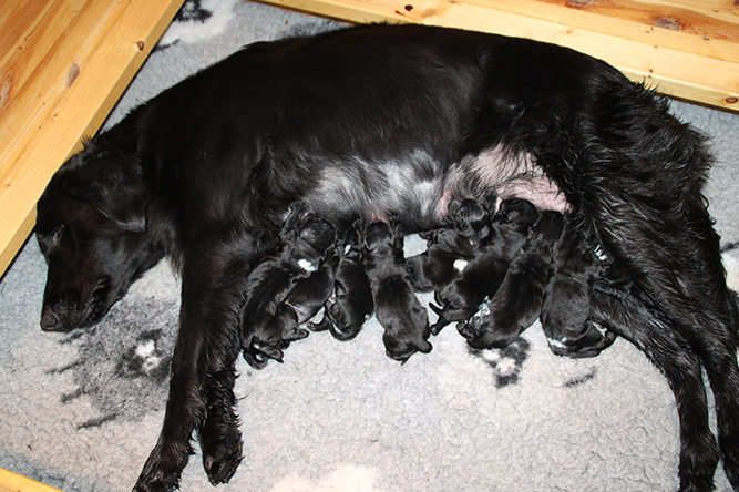 30.09.25. I dag er de skjønne tre døgn gamle. De vokser og trives.Det er mer fart i de når de våkner å skal ha melk. Hvis ikke Kimmie er kjapp til å legge seg så yrer det rundt henne. Noe hun tar med stor ro. Hun vet akkurat hvor hver og en er å legger seg ned der det er ledig plass å aker seg inntil valpene sine. Vi var ute å gikk en litt lenger tur også i går kveld. Kimmie stor kosa seg og var også veldig fornøyd når vi kom inn igjen. :-) Da ble hver å en vasket godt . Her er jente merket rygg og gutt merket halen