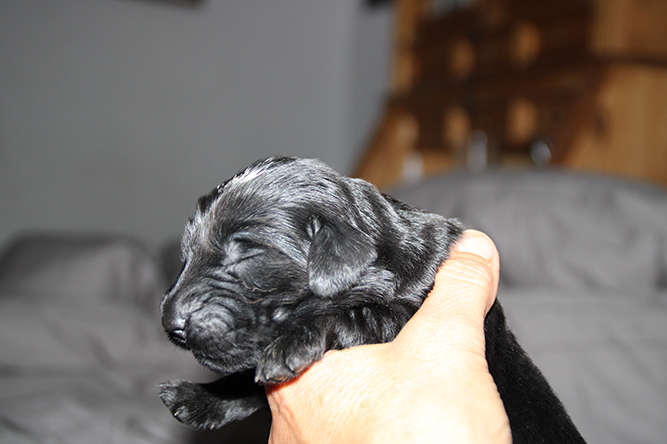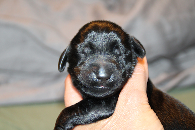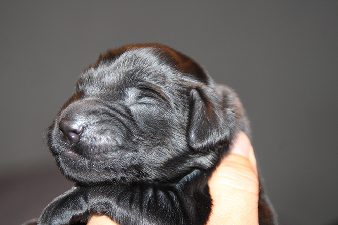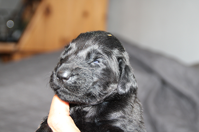 04.10.25. I dag er de skjønne små blitt en uke gamle. Klo klippen ble gjort i går kveld og det gikk fint . Selv om de ikke akkurat sitter rolig når jeg prøver å klippe klørne :-) I dag er det mark kur på menyen. Den må de ha 4 ganger før de skal flytte herifra . Smaker aldri så godt men lurer det i de. Kimmie sin temperatur er mye bedre. Hun har litt  mindre melk foreløpig etter infeksjonen  så vi hjelper til med flaske hver 3 - 4 time så alle får i seg nok. De koser seg med den ekstra melken å er så fornøyde :-)Nå klokken 03.30 er stormen på full fart her ute. Så turte ikke vente med å sende ut valpedagboken i tilfelle nett og strøm forsvinner etter hvert her .Det uler i huset men hundene tar det helt med ro. Her er Gutt merket nakken og jente merket rygg.